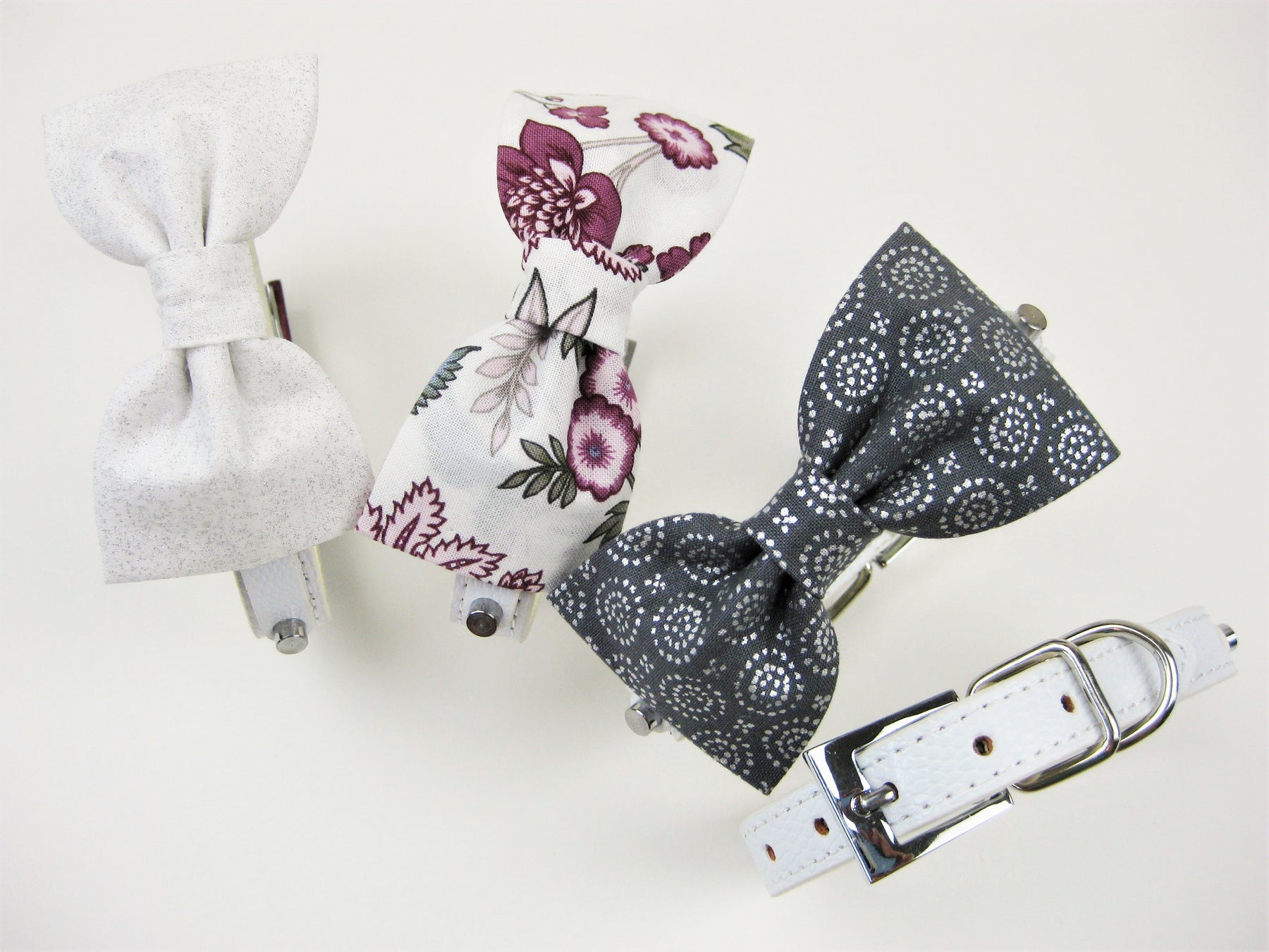 Bow ties will match collar size. Plain metal buckle with soft, synthetic leather. Adjustable buckle, comfy and easy to wipe clean. Your choice of light beige, saddle tan croc, black croc, or white croc.